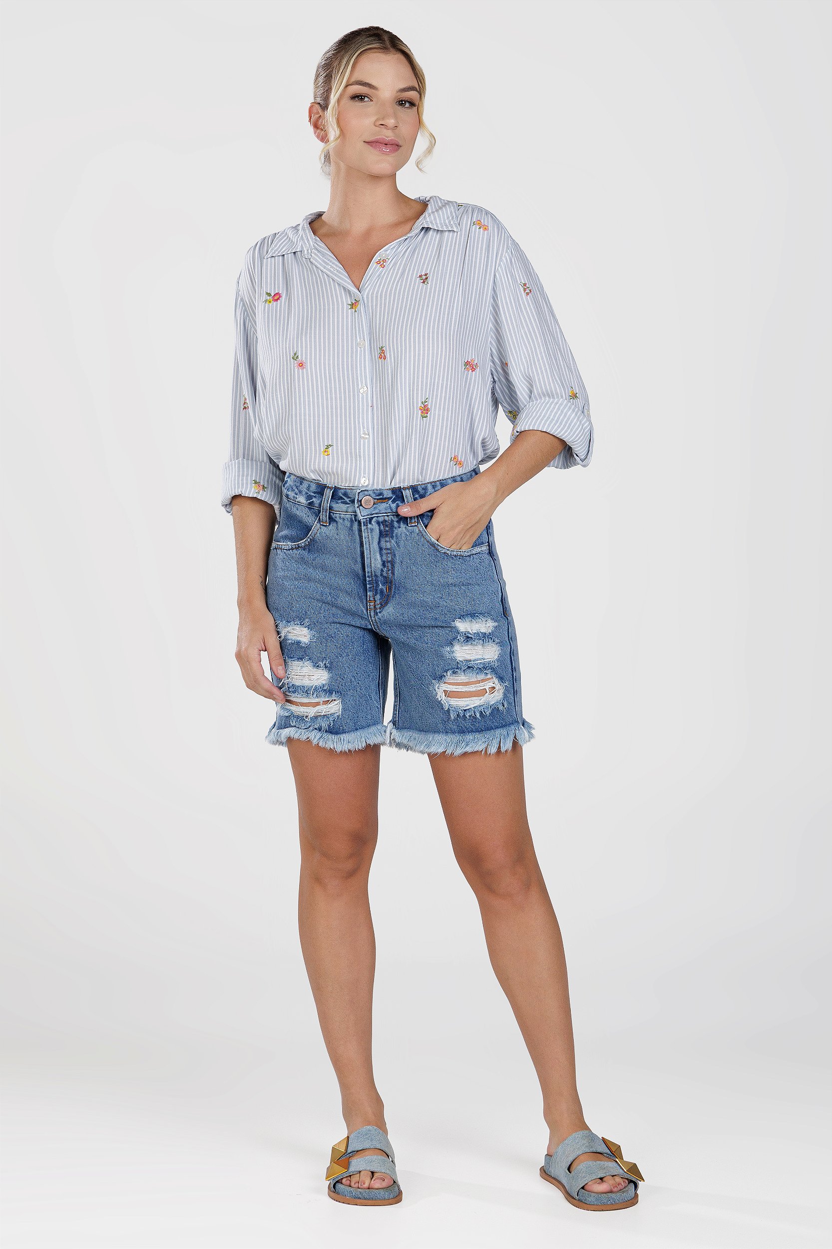 A Bermuda Jeans Feminina Calamar da Santé Denim é a escolha perfeita para quem busca um visual moderno e cheio de personalidade. Sua modelagem de cintura intermediária oferece um caimento impecável que se adapta a diversas ocasiões.