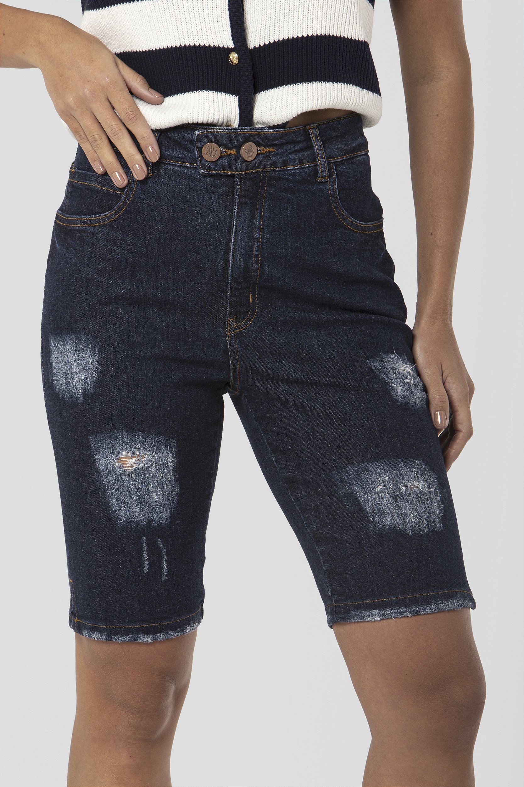 A Bermuda Jeans Feminina Ciclista Pilsen da Santé Denim é a escolha perfeita para quem busca um visual moderno e cheio de personalidade. Sua modelagem ciclista de cintura intermediária oferece um caimento impecável que se adapta a diversas ocasiões.
