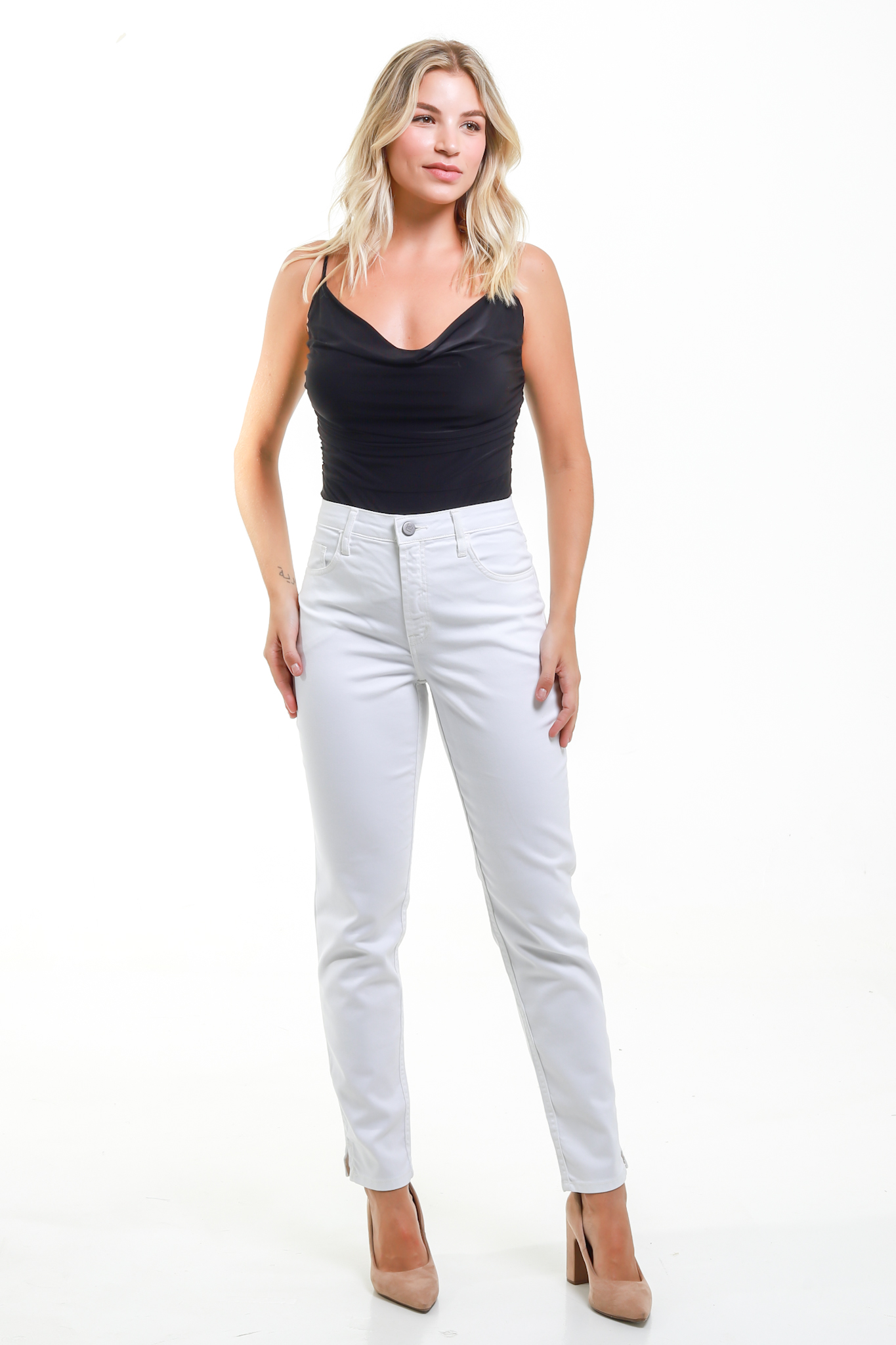 Elegância e conforto se unem na Calça Jeans Skinny Branca Murcia da Santé Denim. A peça-chave para um visual moderno, sofisticado e versátil. Sua modelagem skinny de cintura intermediária oferece um caimento impecável que se adapta à sua silhueta, valorizando o corpo sem abrir mão do conforto.