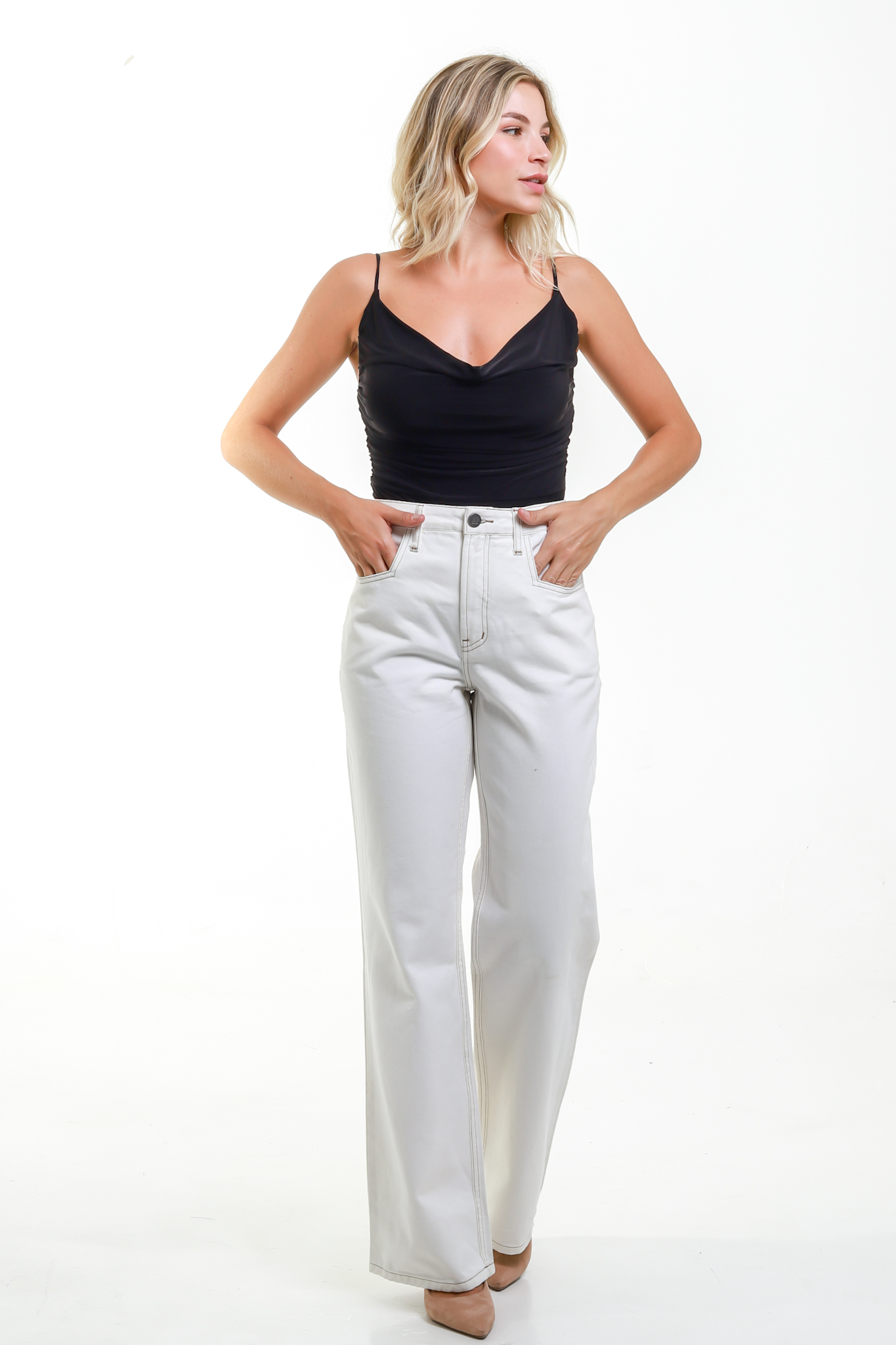 A Calça Wide Leg Sarja Branca Botucatu da Santé Denim é a escolha perfeita para quem busca um visual moderno e cheio de personalidade. Sua modelagem wide leg de cintura alta oferece um caimento impecável que valoriza a silhueta, alonga a perna e se adapta a diversas ocasiões.